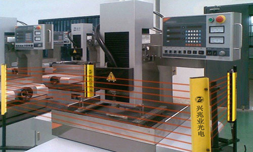 光電保護器主要由發(fā)光器、受光器、控制器組成。它的要作原理為:發(fā)光器發(fā)出的光直射到受光器上,形成保護光幕。當光幕被遮擋時,受光器產(chǎn)生遮光信號,通過信號電纜傳輸?shù)娇刂破?,控制器將此信號進行處理,產(chǎn)生控制信號,控制機床的制動控制回路或其他設備的報警裝置,實現(xiàn)機床停車或安全報警。從而起到安全人作用. 安裝光電安全保護裝置,可以防